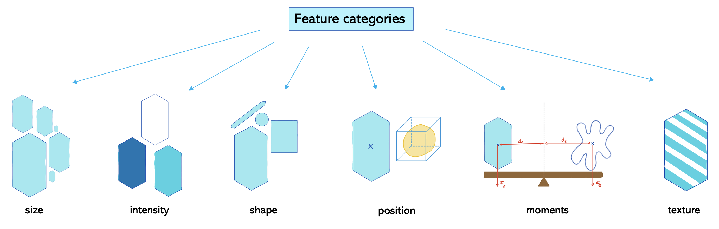 Nous voyons que nous devons spécifier quelles catégories de caractéristiques nous voulons mesurer. Une façon de diviser ces catégories est montrée ici :