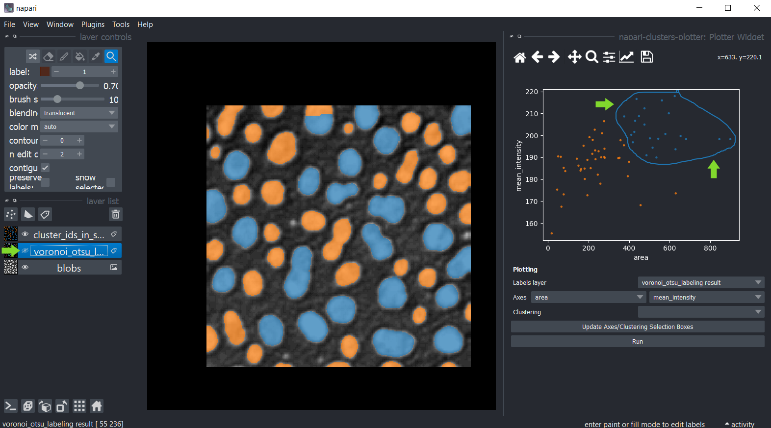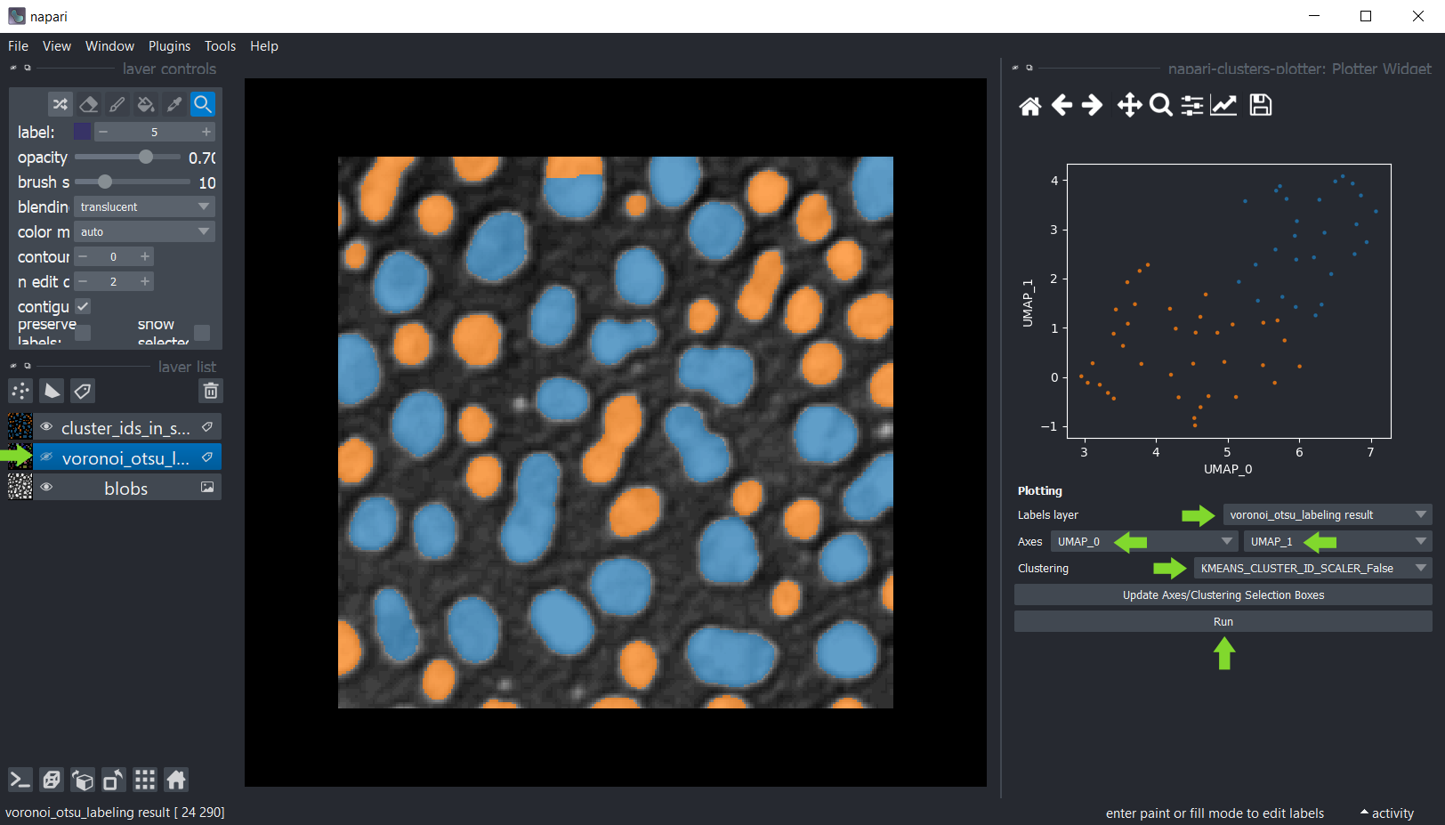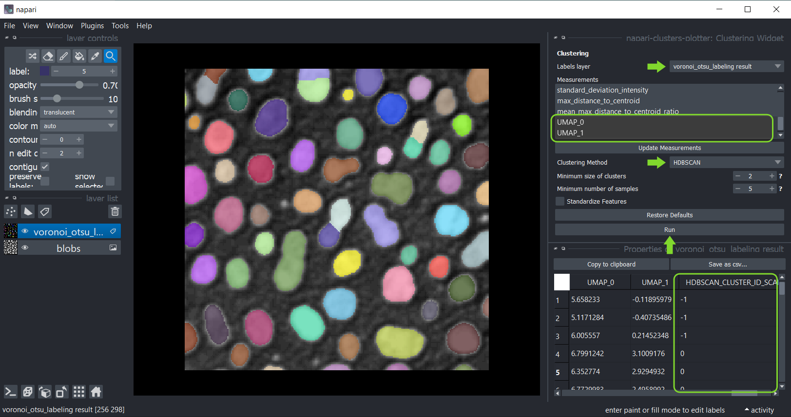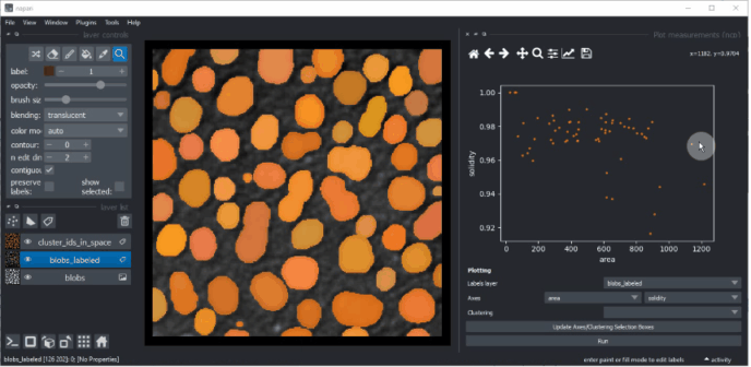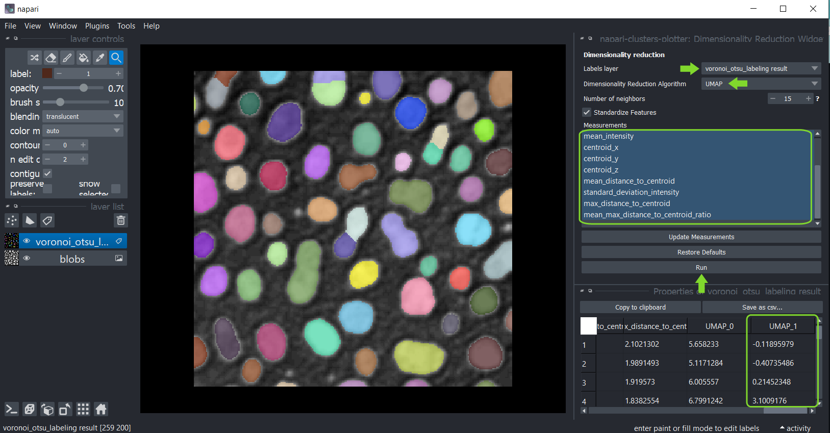 Le napari-clusters-plotter offre des outils pour effectuer divers algorithmes de réduction de dimensionnalité et méthodes de clustering de manière interactive dans Napari.