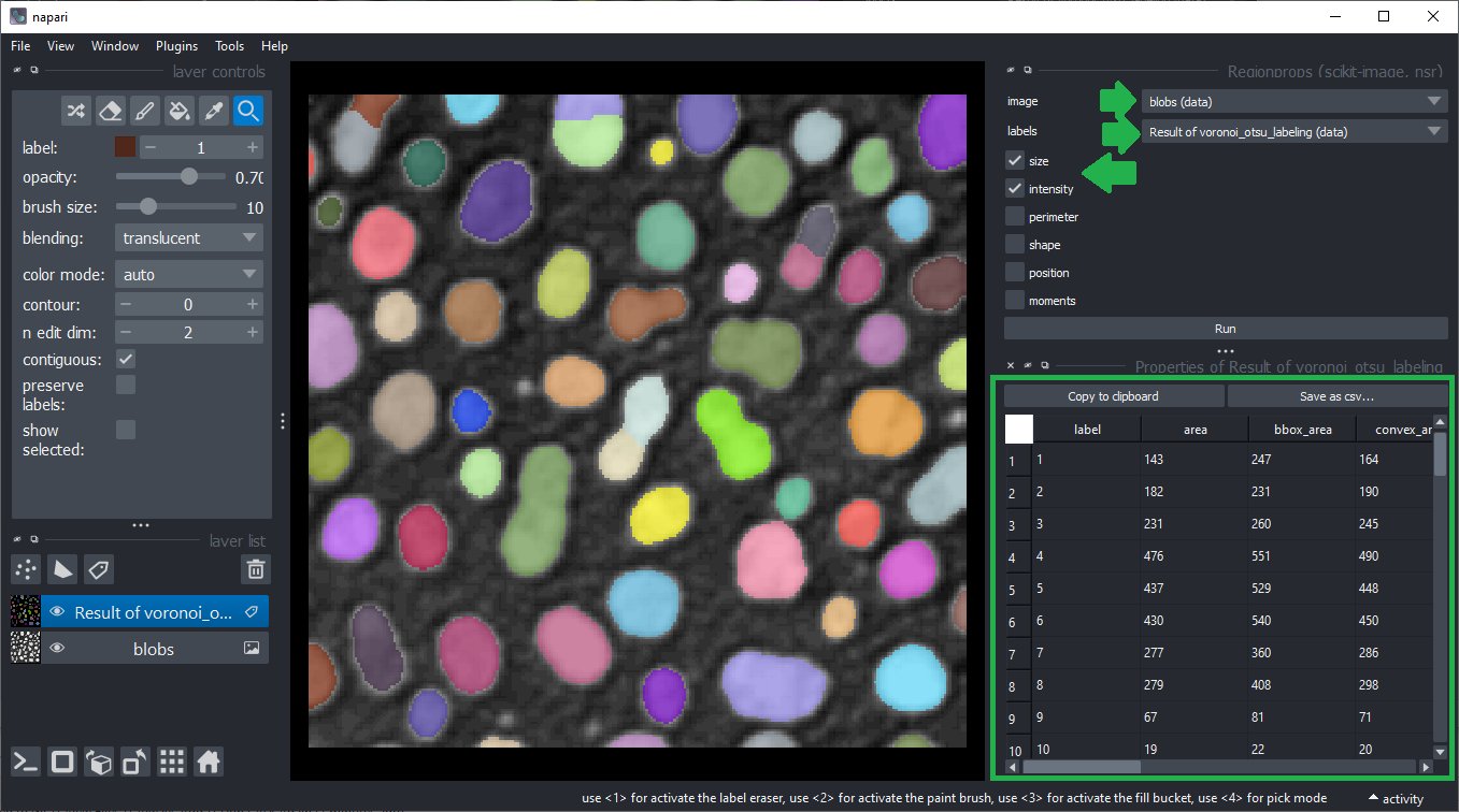 Sélectionnez simplement l’image d’intensité, l’image d’étiquettes correspondante et les mesures intensité, taille et forme puis cliquez sur Exécuter.