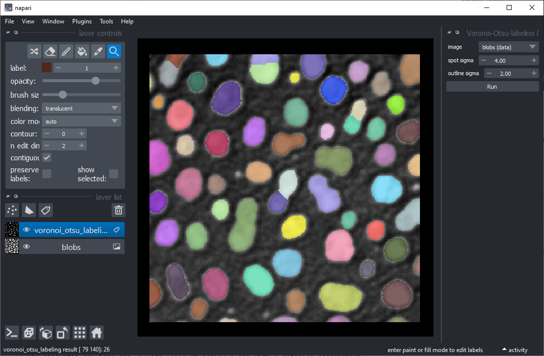 Nous avons également besoin d’une image d’étiquettes. Vous pouvez la créer en utilisant le menu Outils > Segmentation / étiquetage > Étiquetage Gauss-Otsu (clesperanto).